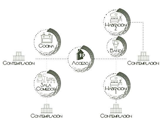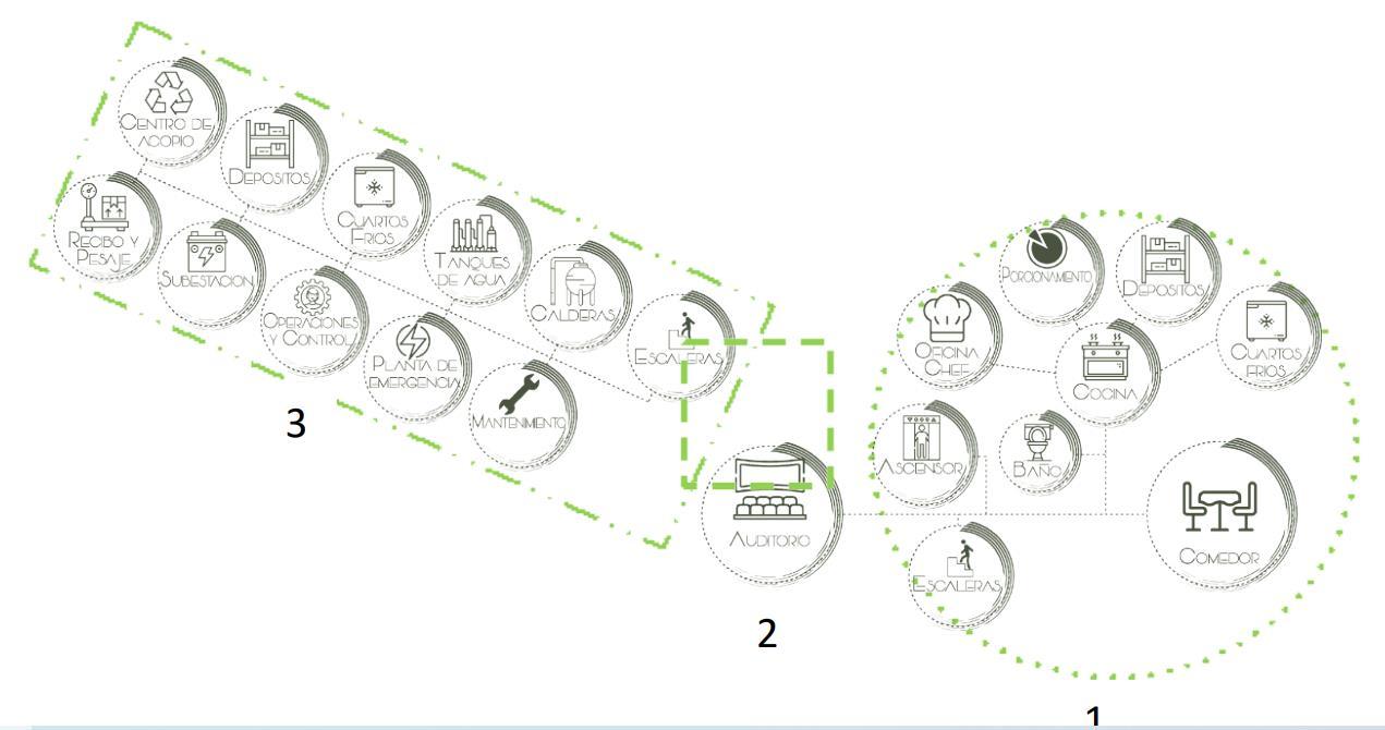 Para cada edificación tiene un eje que reparte las diferentes áreas para generar una continuidad en los recorridos