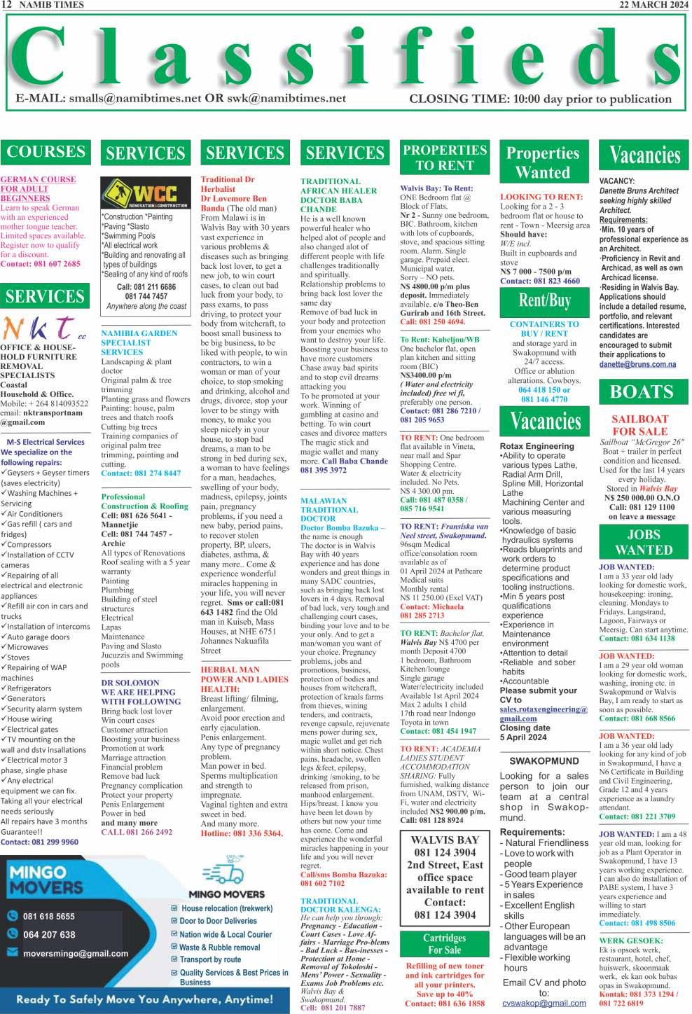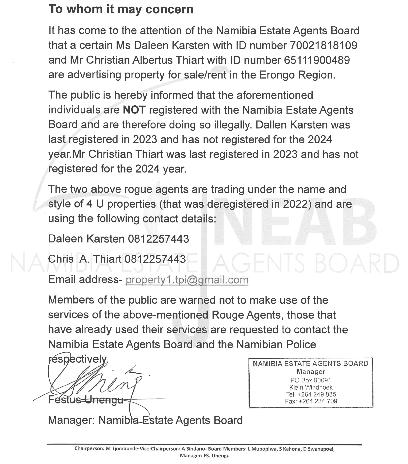 Anypersonhavinganyobjectiontotheapprovalofthisapplication,must lodge such objection, together with grounds thereof, with the General Manager: Roads and Building Control, (Town Planning), Private Bag 5017,WalvisBayandtheapplicant,inwriting,notlaterthan5April2024.