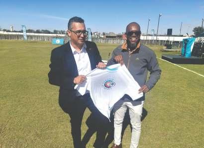 Walvis Bay Mayor, Trevino Forbes and FNB Namibia Area Manager, Joram Kahono at the launch of FNB Namibia's Classic Clashes at the Jan Wilken Stadium in Walvis Bay