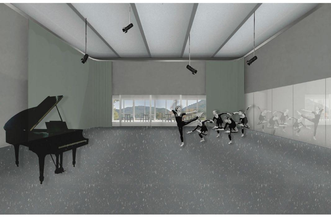 The Dance school in Giubiasco, is situated parrallel to the trainrails and is in direct relation to the local trainstation. The building is integrated within the industrial context. The structure is made out of load bearing wall partitions. The upper floors are held up by steel tie rods. The central core of the building consists of double height dance studios illuminated by skylights. The title of the building ‘CÔTÉ RAILS, CÔTÉ JARDIN’ is the french concept of theatre where the perfomance takes place either on the front stage or the back stage. The CÔTÉ RAILS represents the front stage open towards the public and CÔTÉ JARDIN represents the back stage towards the garden open to the students and teachers. Even tough the building divides the site in two it has an open groundfloor in order to create openess towards the backside of the building connecting the town of Giubiasco with the bulding.