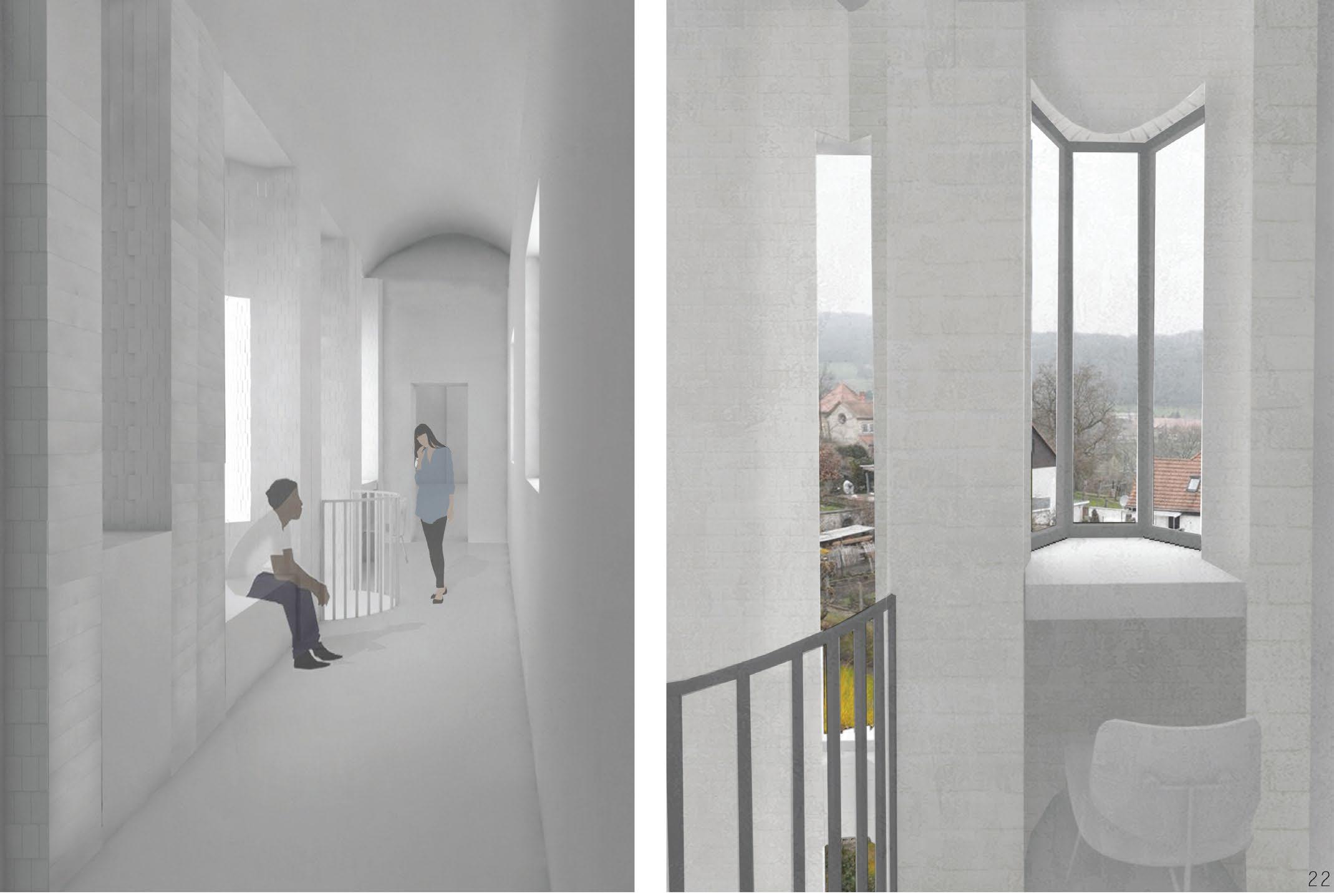 The Saalecker Werkstatten is a complex with a negative historical connotation regarding it’s past of nazi second world war. In order to remember and at the same time erase the negative past we as students worked on several interventions in and on the site. The selected intervention is the insertion of an object/furniture piece. It is situated in the corridor connecting the main house with the new extention. The corridor functions as a joint between the two entities. It functions just as a passageway to go from point A to B. By introducing niches in the blind wall without windows facing the garden the corridor becomes a light space where one can stay. Each niche has small functions inside like a study space, reading space, shelf and double height space to look down and to look out into the garden. The niches are made out of brick just like the existing structure. different brick patterns and windows give a different character to each of the niches.