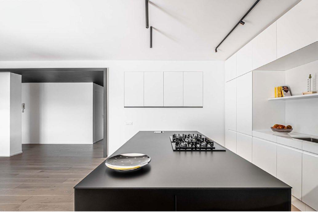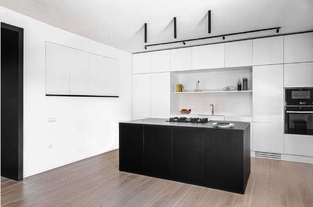 In the open space, the absolute protagonist is the kitchen, designed ad hoc by the studio and custom made by artisans. A white wardrobe with a large central box, in contrast with the black island block.