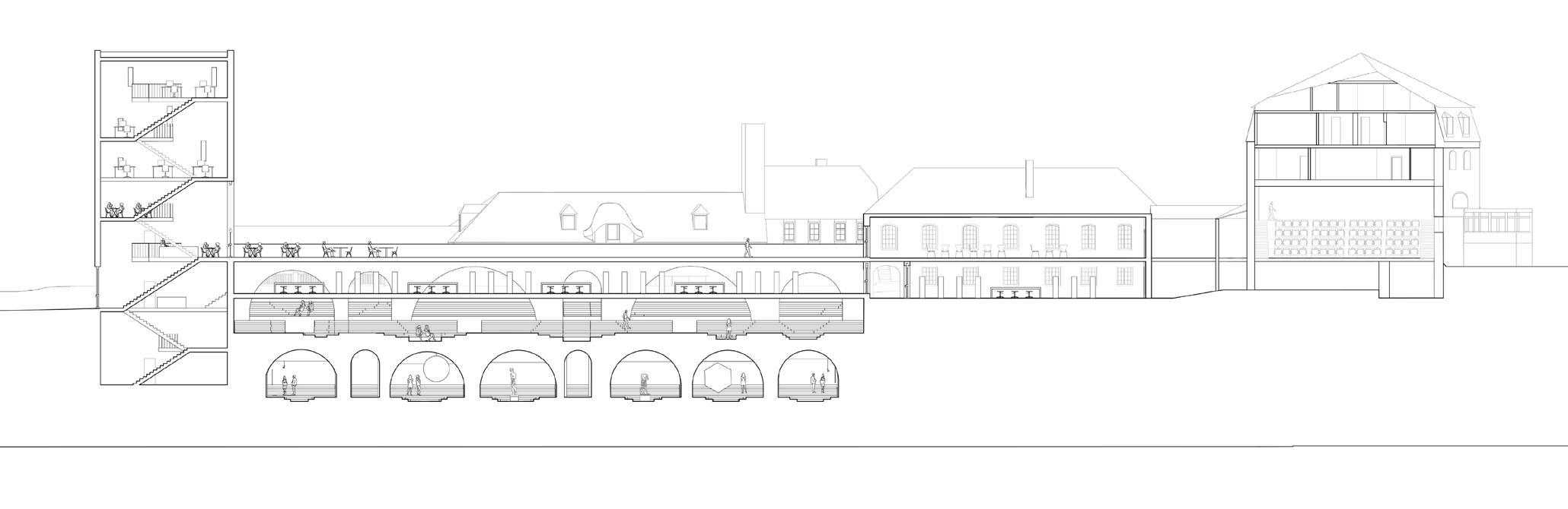 The program of the exercise: ‘Addition’ was to create a document center, exhibition spaces, education center, foyer/auditorium and restaurant. The addition functions as a joint in between the existing buildings. The buildings consist out of a bridge in which we find the archive/documentation center and connects the existing building to the tower. The tower households the main entrance, the restaurant and offices on the upper floors. The exhibition space is under the ground and the roof of the exhibition space has a square where you can pass through under the bridge towards the garden.