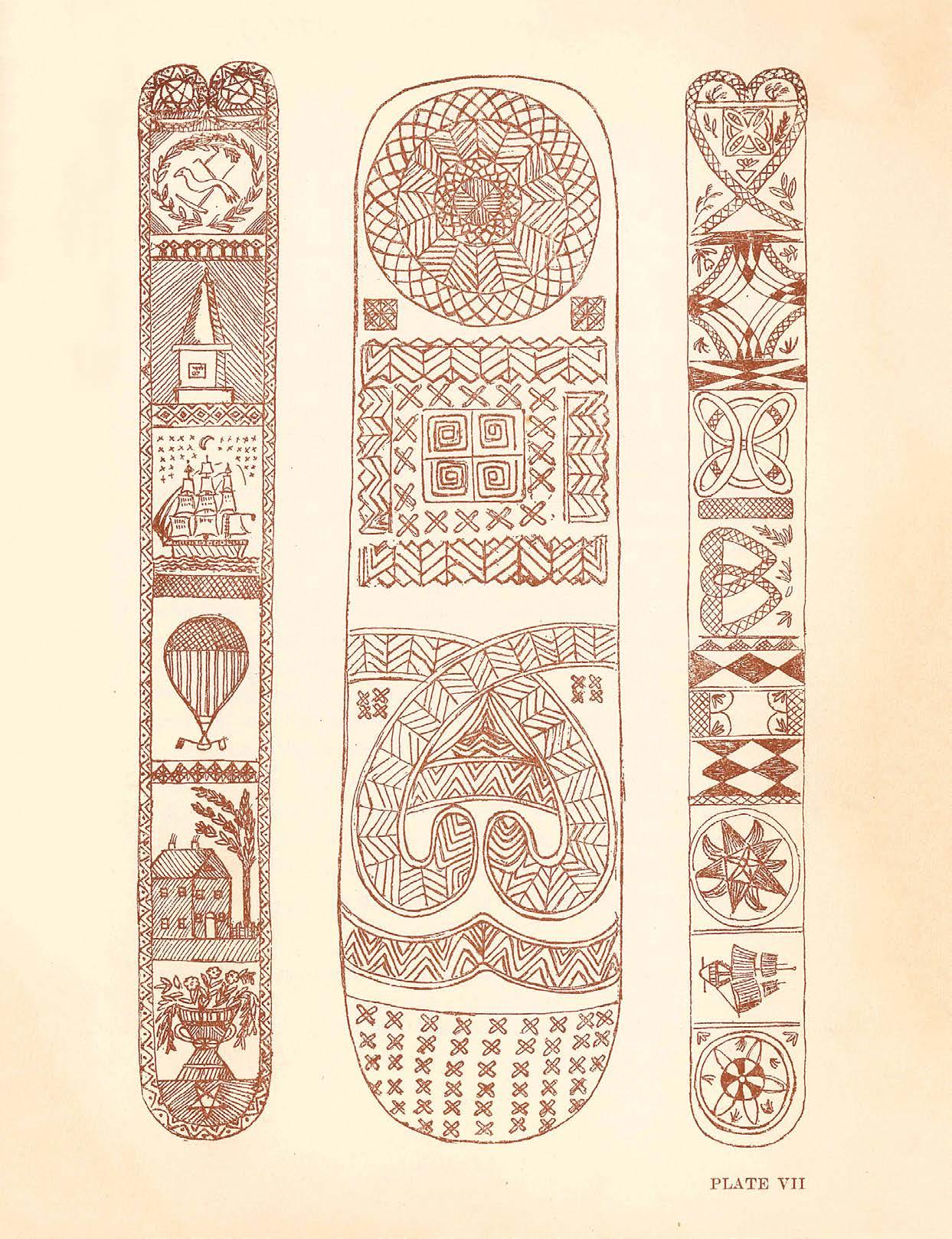 Left: Jane Davenport, sketches of scrimshaw corset busks, from Scrimshaw: Folk Art of the Whalers (Cold Spring Harbor, NY: Whaling Museum Society, 1957). Image courtesy of the Nantucket Historical Association.