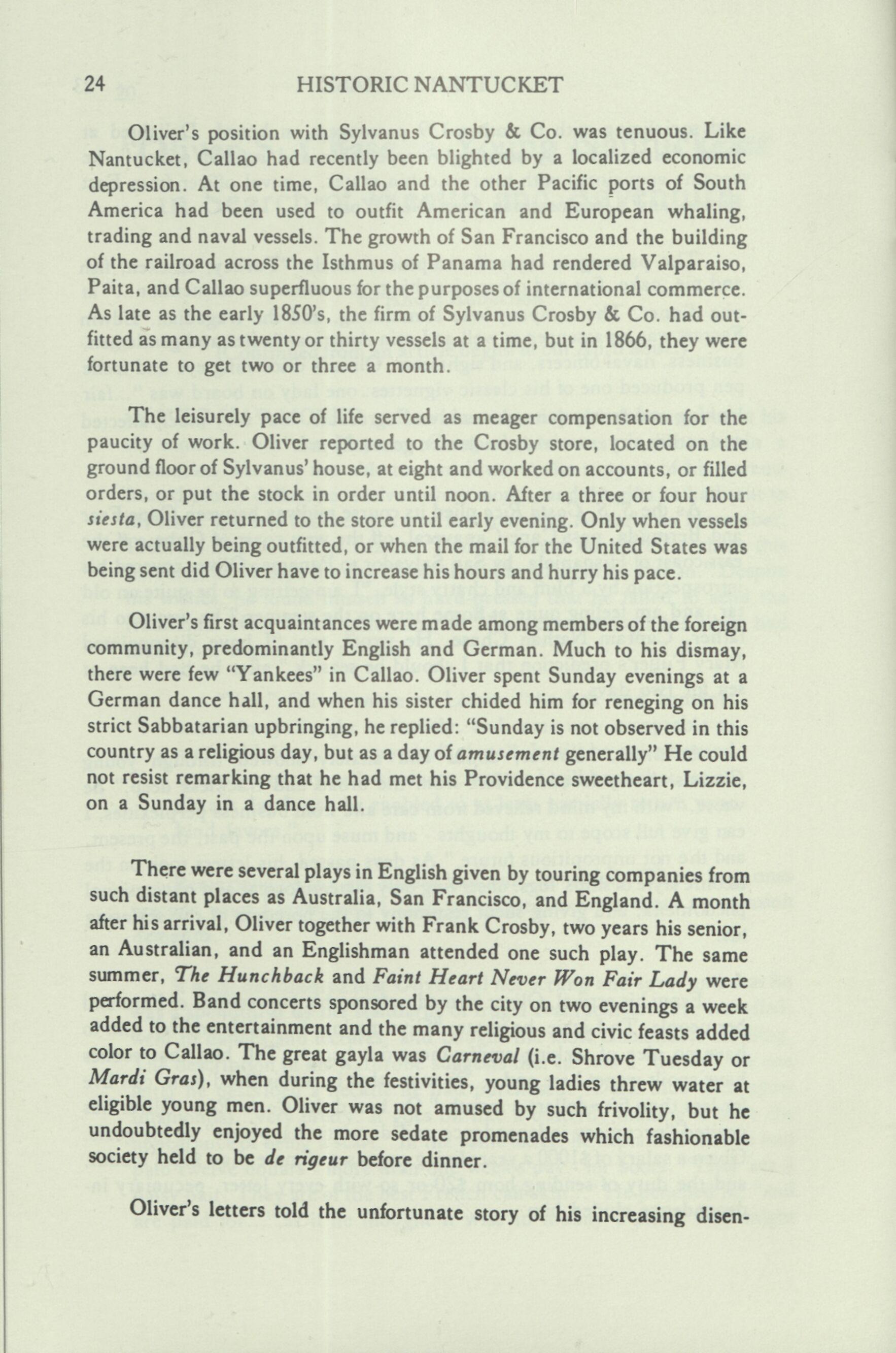 Oliver's position with Sylvanus Crosby & Co. was tenuous. Like Nantucket, Callao had recently been blighted by a localized economic depression. At one time, Callao and the other Pacific ports of South America had been used to outfit American and European whaling, trading and naval vessels. The growth of San Francisco and the building of the railroad across the Isthmus of Panama had rendered Valparaiso, Paita, and Callao superfluous for the purposes of international commerce. As late as the early 1850's, the firm of Sylvanus Crosby & Co. had outfitted as many as twenty or thirty vessels at a time, but in 1866, they were fortunate to get two or three a month.