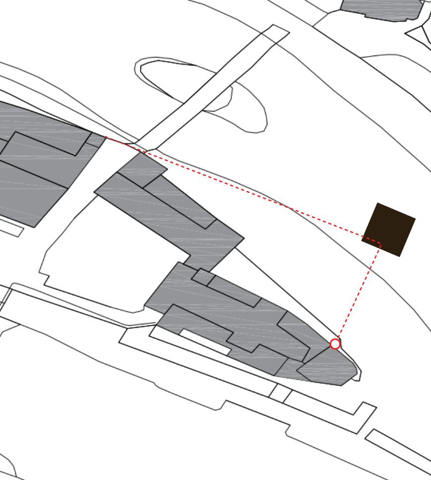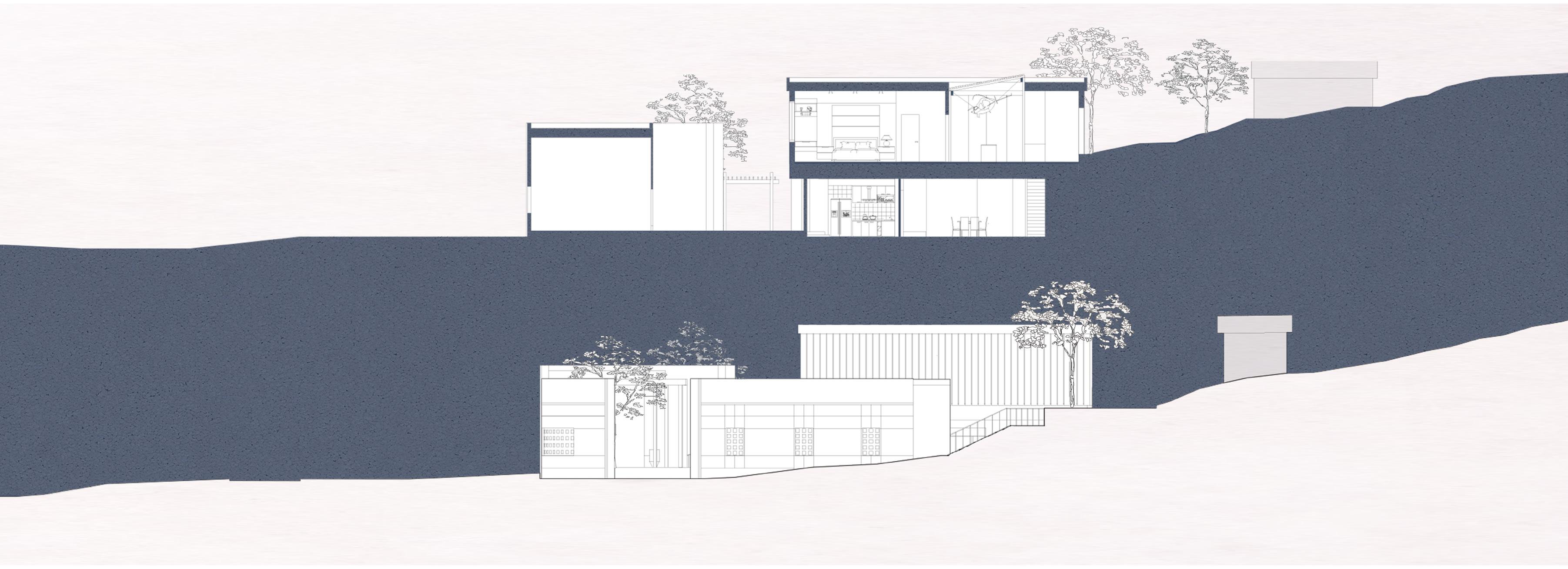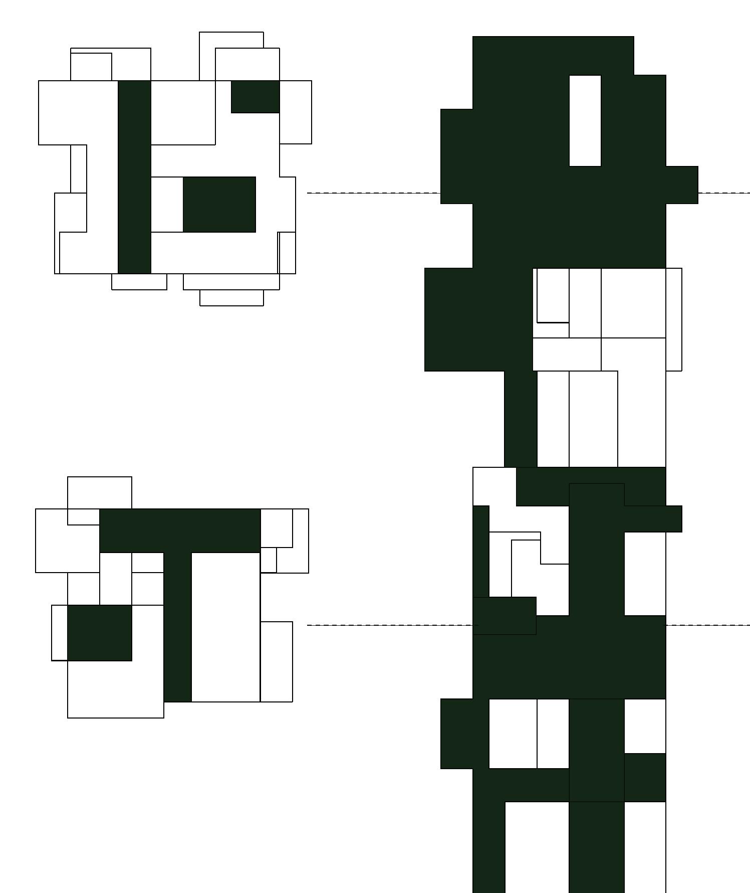 The plan and section are abstracted into a coded system of mass and void, where thickness and materiality translate concealment and resistance into spatial form.