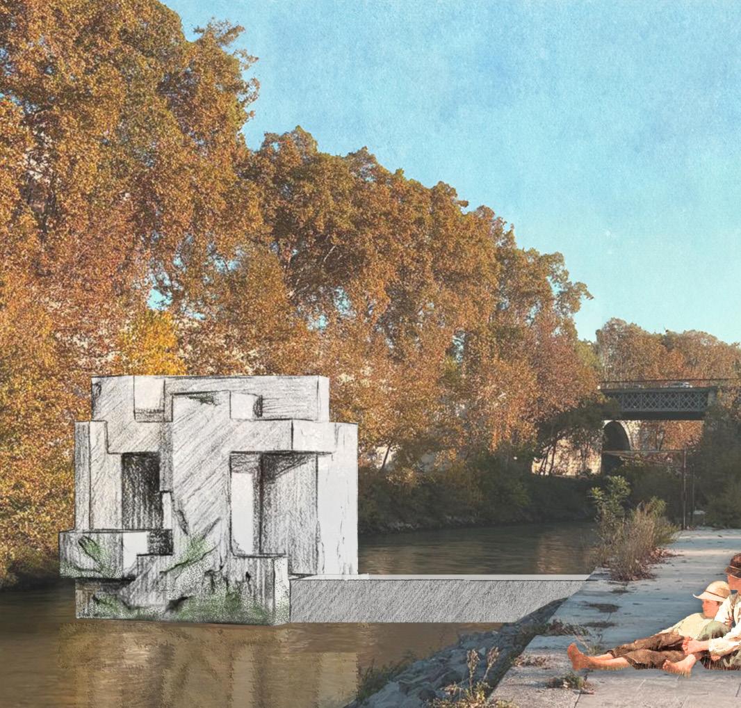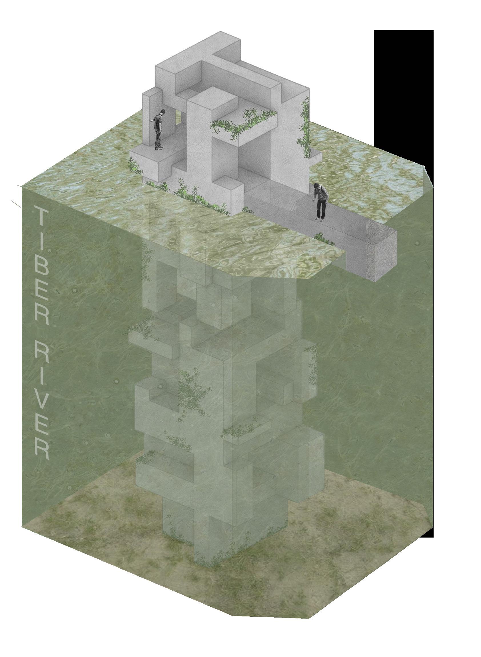Attuned to the Tiber’s persistent current, the concrete resist the river’s flow and adapt to its unpredictable rise and fall -- representing persistance.