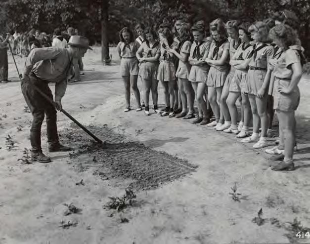 This August 1941 photograph shows U.S. Forest Service Ranger Raymond McKinley demonstrating how to rake a fire-line at the Chattahoochee National Forest in Georgia. This was part of the training the Forest Service provided to prevent and control forest fires. These particular trainees were campfire girls from Camp Toccoa, a summer organization camp located in the forest. As custodians of 193 million acres of land, the U.S. Forest Service has, over its history, engaged in numerous activities to educate the public about national forests, including how to prevent and mitigate forest fires.