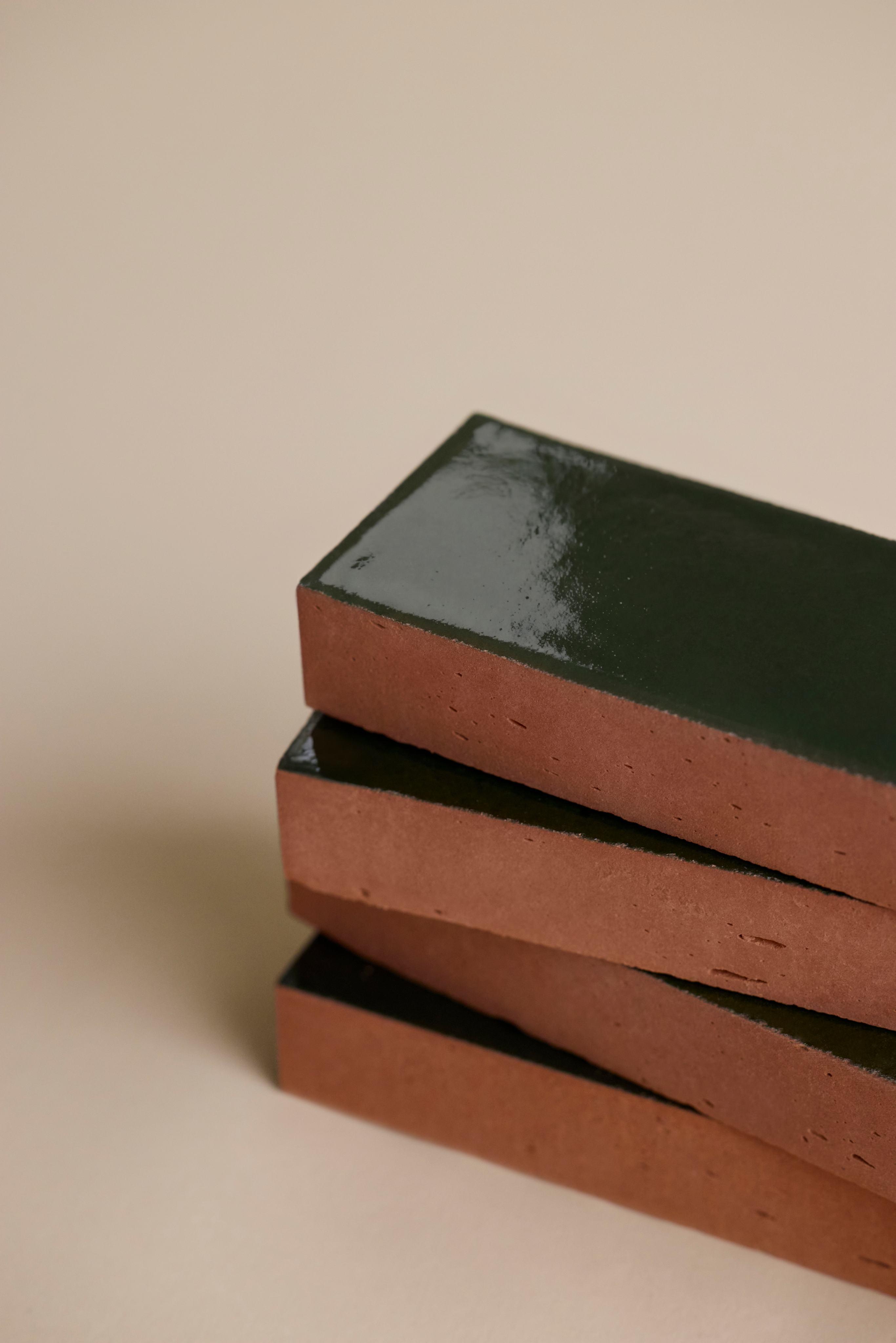 Each Origins clay tile is finished with a colored liquid enamel that is applied by hand, creating its signature glossy surface. The tiles are then fired in kilns at temperatures exceeding 1050°C, a process that defines both the final color and the subtle texture of the glaze.