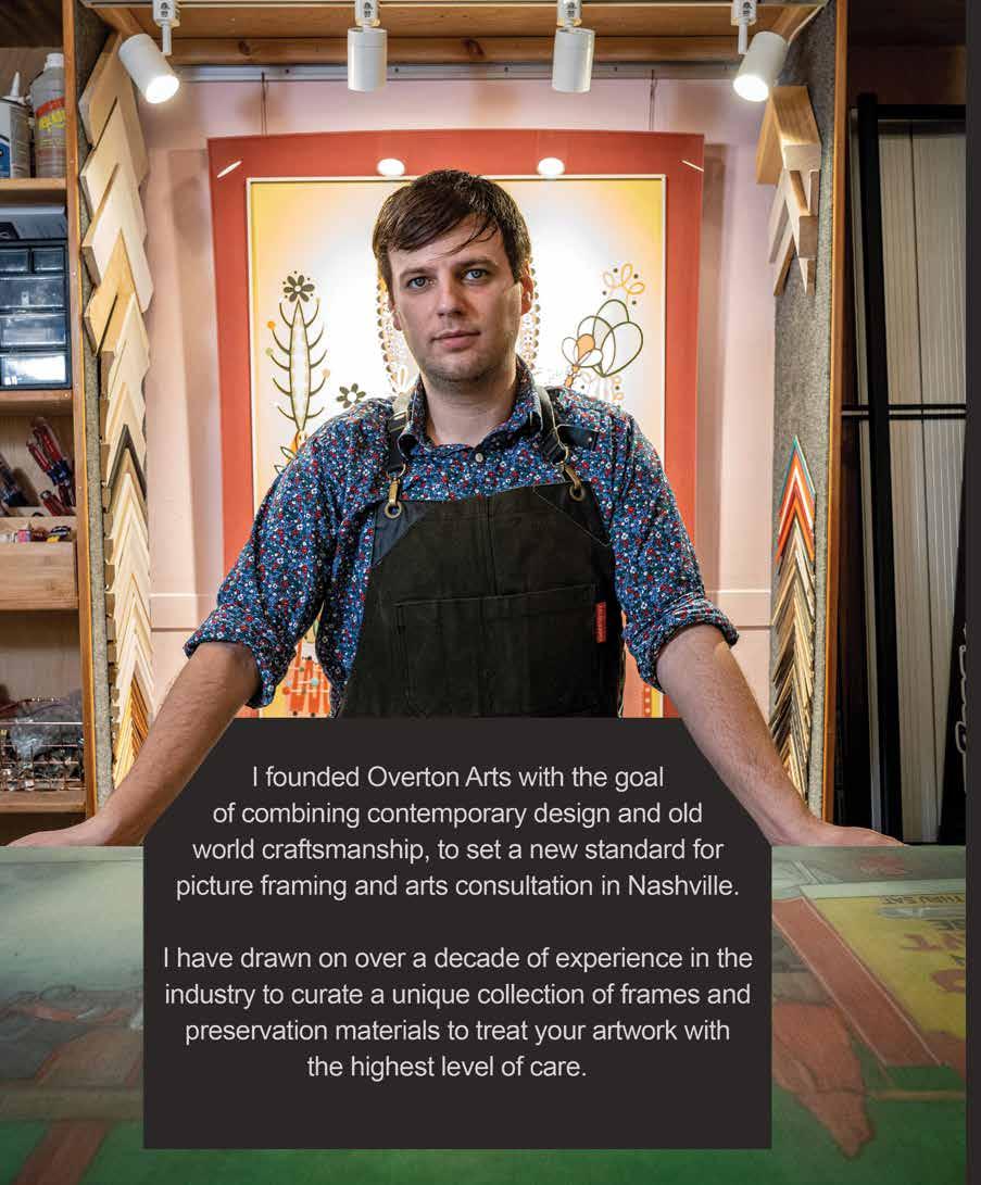 Robert Jones founded Overton Arts in 2018 with the goal of creating a picture frame shop that emphasizes community engagement by embracing nonprofit arts initiatives and programming. Overton Arts combines a traditional workshop with an art studio to provide clients with not just a transactional relationship, but a connection to the wider arts community. In 2020, Overton Arts donated $2,500 to Gideon’s Army in support of their ongoing efforts to use restorative justice programs to build resilient kids and healthy communities. Last year he sponsored the Just Us program at The Oasis Center, which provided LGBTQ+ youth with a liberating space to be authentic and celebrate the fluidity of identity, to help reach their full potential. This issue of Nashville Interiors is Robert’s first as arts editor.