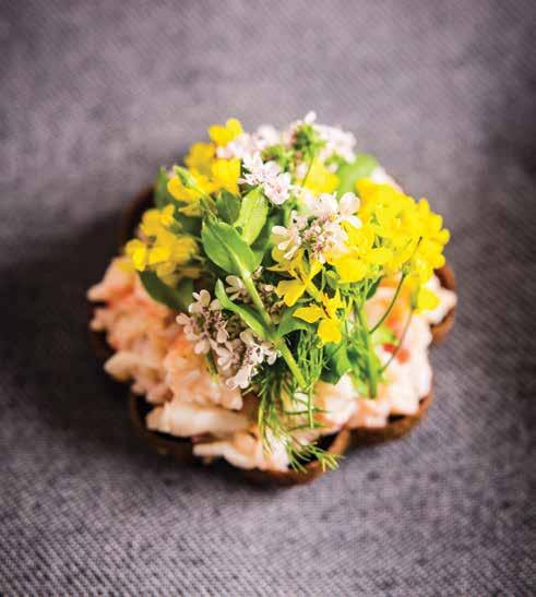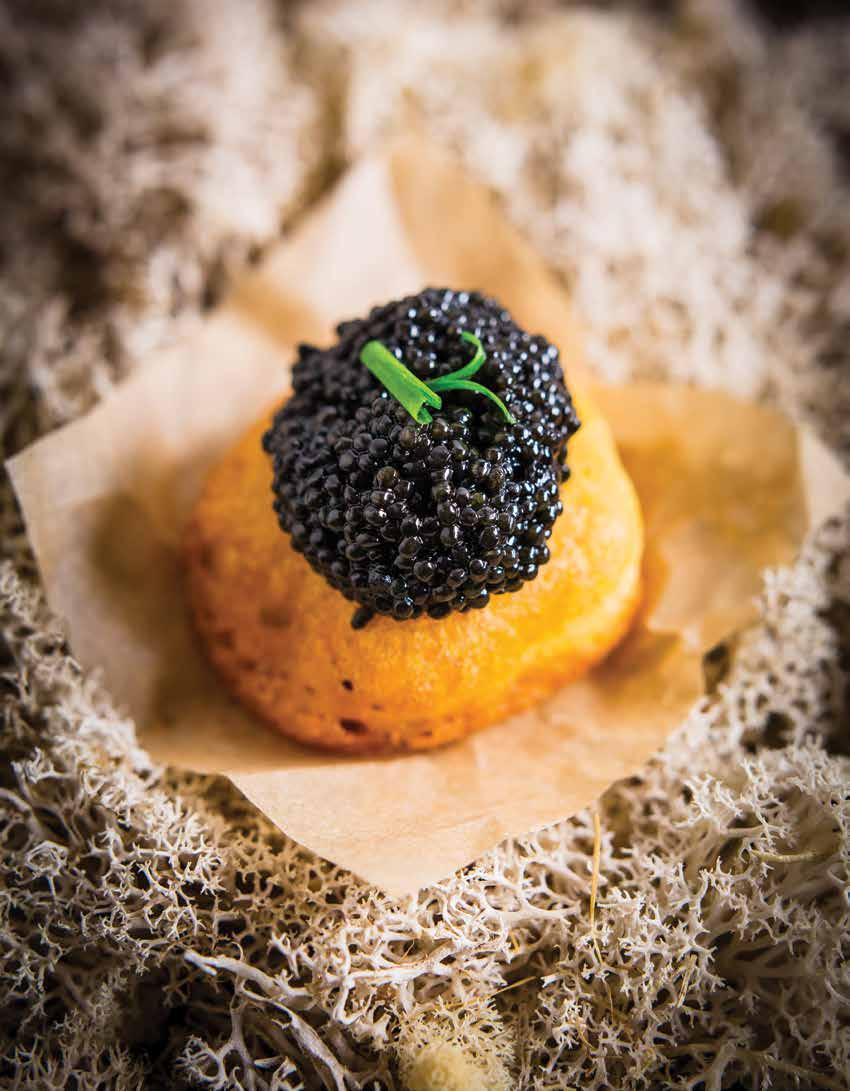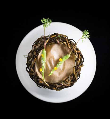 five-act play for the senses as they travel through 20-plus dishes of a menu that details descriptions and concepts of canapes, water, land, dessert and petit fours. These courses include intricate, artful plates that are playful on the palate. The summer menu’s first course includes dishes such as Foie Gras, Finger Lime, Hoshigaki and Barley and Grilled Lobster with Lovage & Benne.
