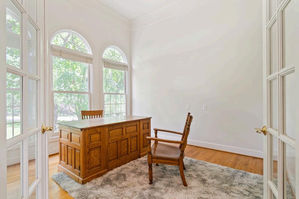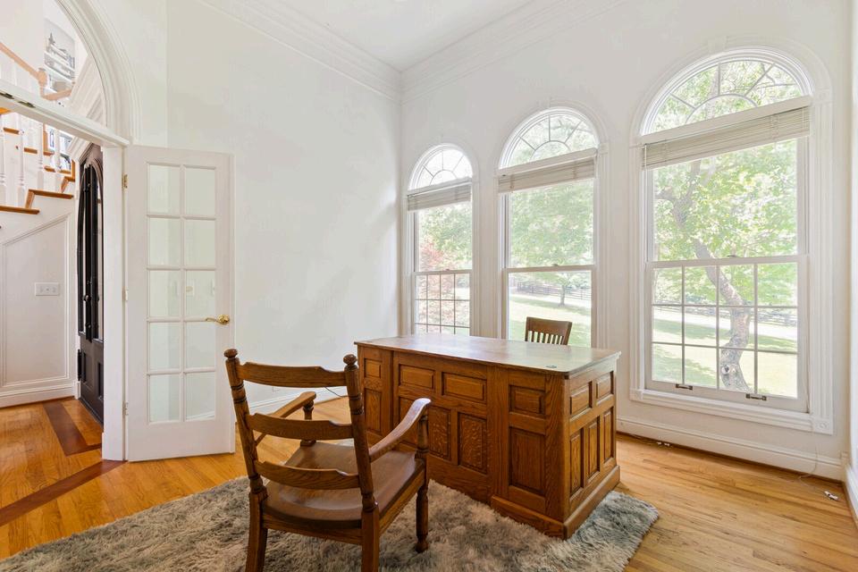 A dedicated office on the main level features double glass French doors, hardwood floors, high ceilings, and striking transom windows that create an