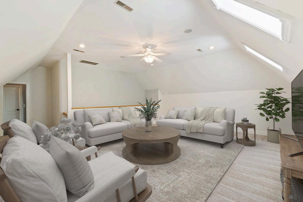 The second level also features a large bonus ro ideal for a media space, playroom, or additional li area, with its own stair access to the kitchen. A secondary laundry area o this level adds convenien for busy households.