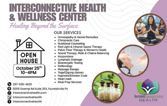 Interconnective Health will open its new wellness center at 5055 Swamp Road, Suite 203, in Fountainville, on October 1, offering a wide range of holistic services to support body, mind and spirit. To celebrate, the center will host an Open House from 10 a.m. to 4 p.m. on October 25, inviting the public to tour the facility, meet practitioners, explore services and connect with a community focused on integrative well-being. Refreshments will be provided.