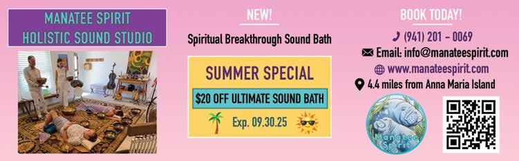 Manatee Spirit Holistic Sound Studio will be hosting community events over the next few months as well. You are invited to partake in a “Full Moon Ceremony” on August 9, from 7–9 p.m. (cost to attend is $35). Manatee Spirit is also introducing a new “Universal Wisdom and Meditation Course” on September 8, 15, and 22, from 6–8 p.m. (cost to attend is $195, in-person or online). Finally, there will be a “Sound Healing Course” on October 4 and 11, from 1–4 p.m. (cost to attend is $195, in-person).
