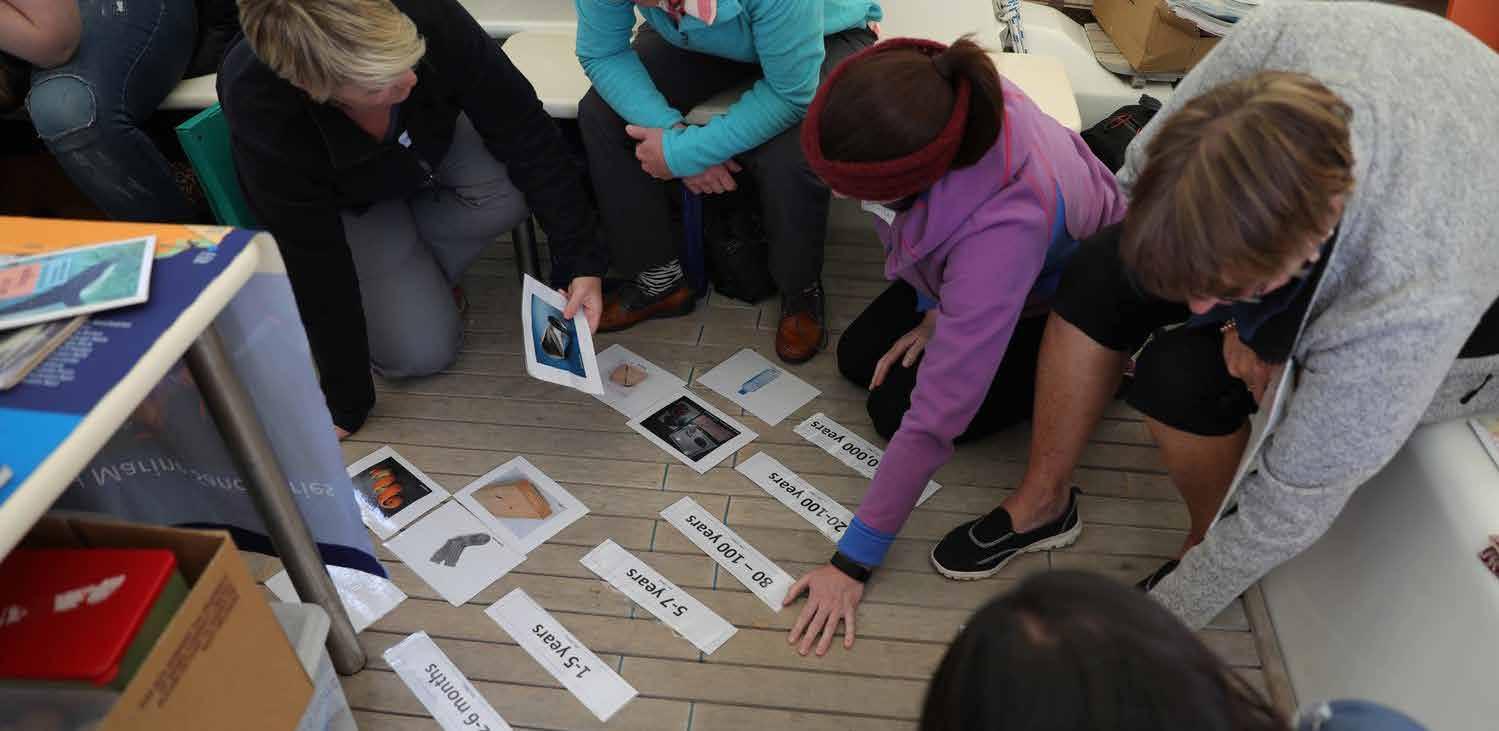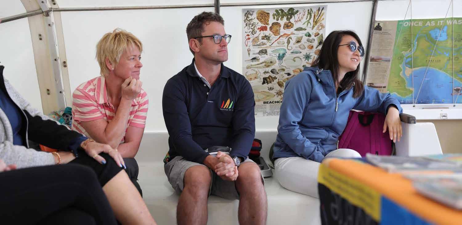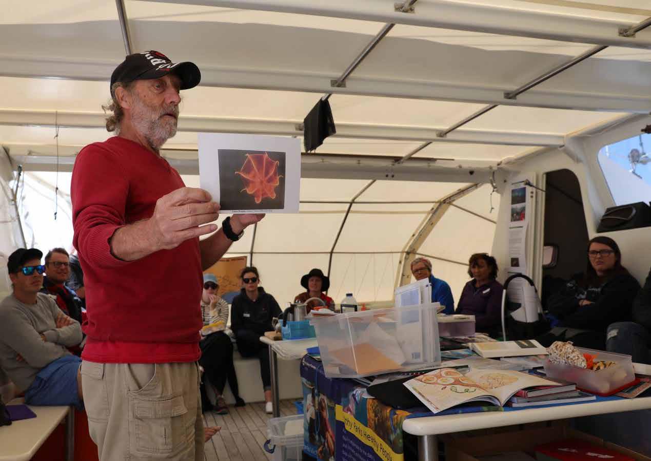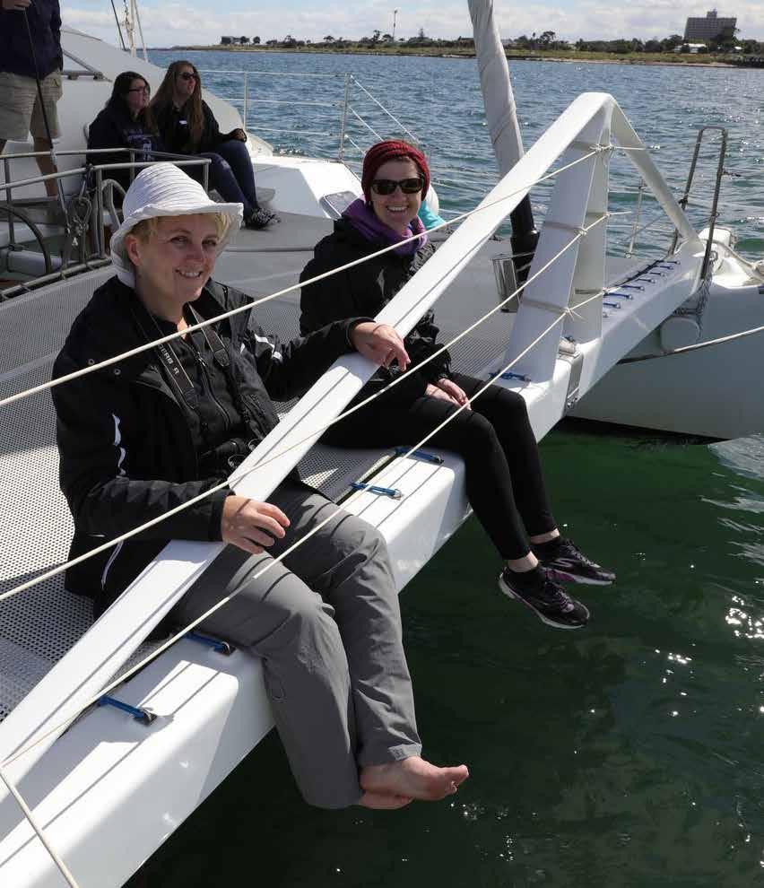 Previous page: St Mary's Williamstown teachers aboard the SV Pelican 1. Middle row, left: Harry Breidahl teaching ocean literacy. Middle row, right: Dominique, teachers and guests looking very content with the day out on the Bay. Photography: Natalie Davey, courtesy Pelican Expeditions.