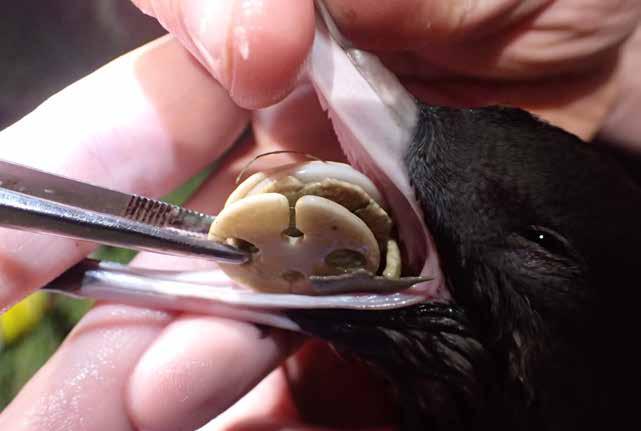 Several balloon clips are removed from a flesh-footed shearwater during research on Lord Howe Island.