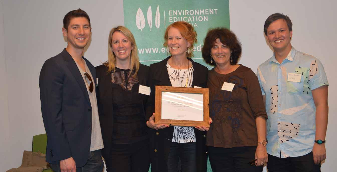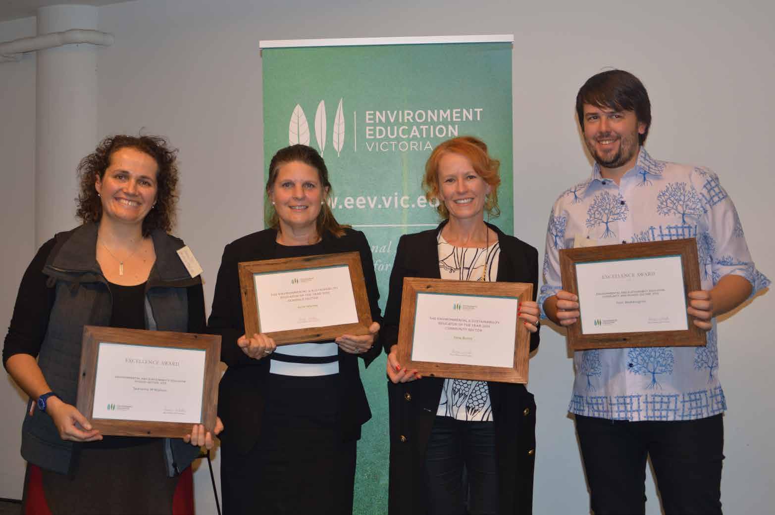 Previous page: (Left to right) Jeanette McMahon of Winters Flat Primary School (School sector Excellence), Julie Wynne of St Louis de Montfort Primary School, Jane Burns of CERES Community Environment Park (joint winners of the 2015 EEV Environmental and Sustainability Educator of the year), Tom Reddington of the AYCC (Community sector excellence). Photography: Skye Ambrosy