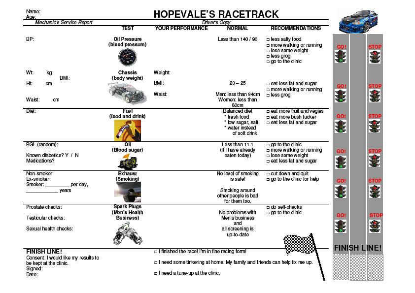 In the community we decided to run a program called the Pit Stop Program, which was developed by Gayscone Public Health Unit group in Western Australia. It was originally developed to as a nonthreatening fun way to educate men about health and has been successfully run at a range of locations including shopping centres and festivals. It uses the analogy of a how a racing car relates to the human body with oil pressure representing blood pressure, fuel representing diet etc. The participant is given a service form and moves from station to station learning about health.
