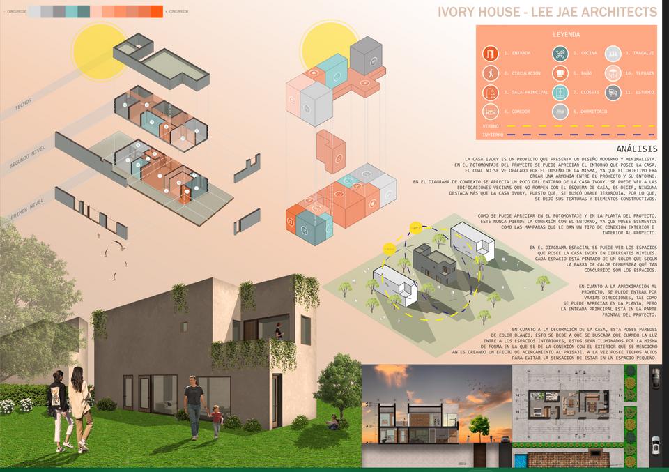Este panel posee elementos como los diagramas y los fotomontajes ambientados de manera realista.Estoselementospermitenverlostiposdeespaciosquehay,suorganizacióndentrodel volumen,suentornoylaambientaciónqueposeeelproyectodeunaformaescritayvisual.