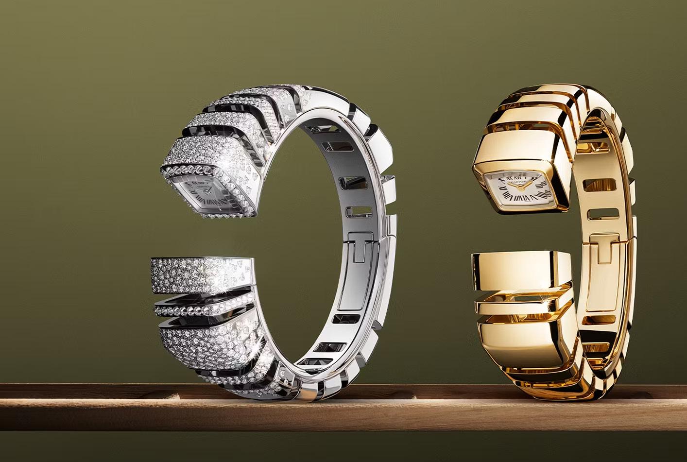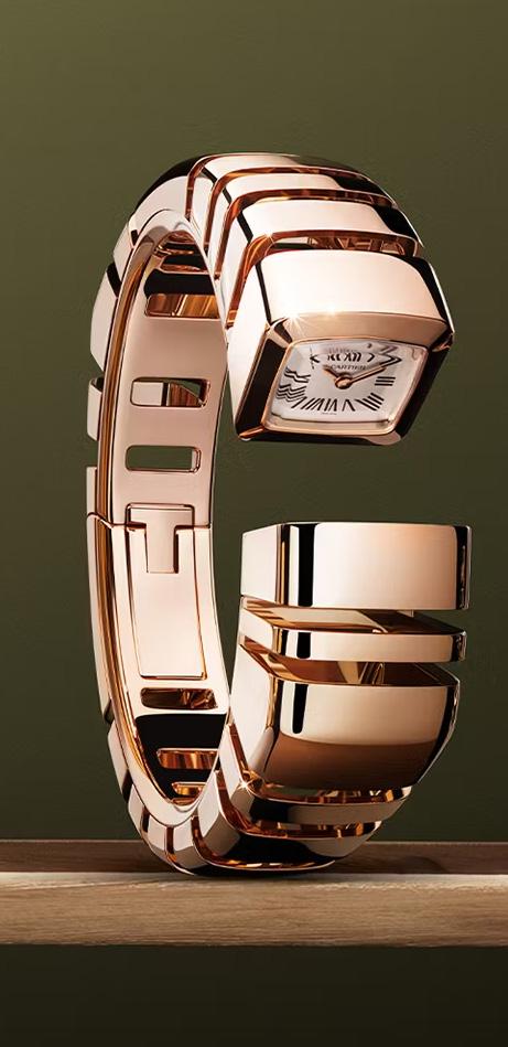It all starts with the open bracelet’s unprecedented generous architecture, which blends openwork and polished reflective gold with elongated lines and defined edges. Tension culminates as a delicate dial meets its reflection, where time appears to move backwards.