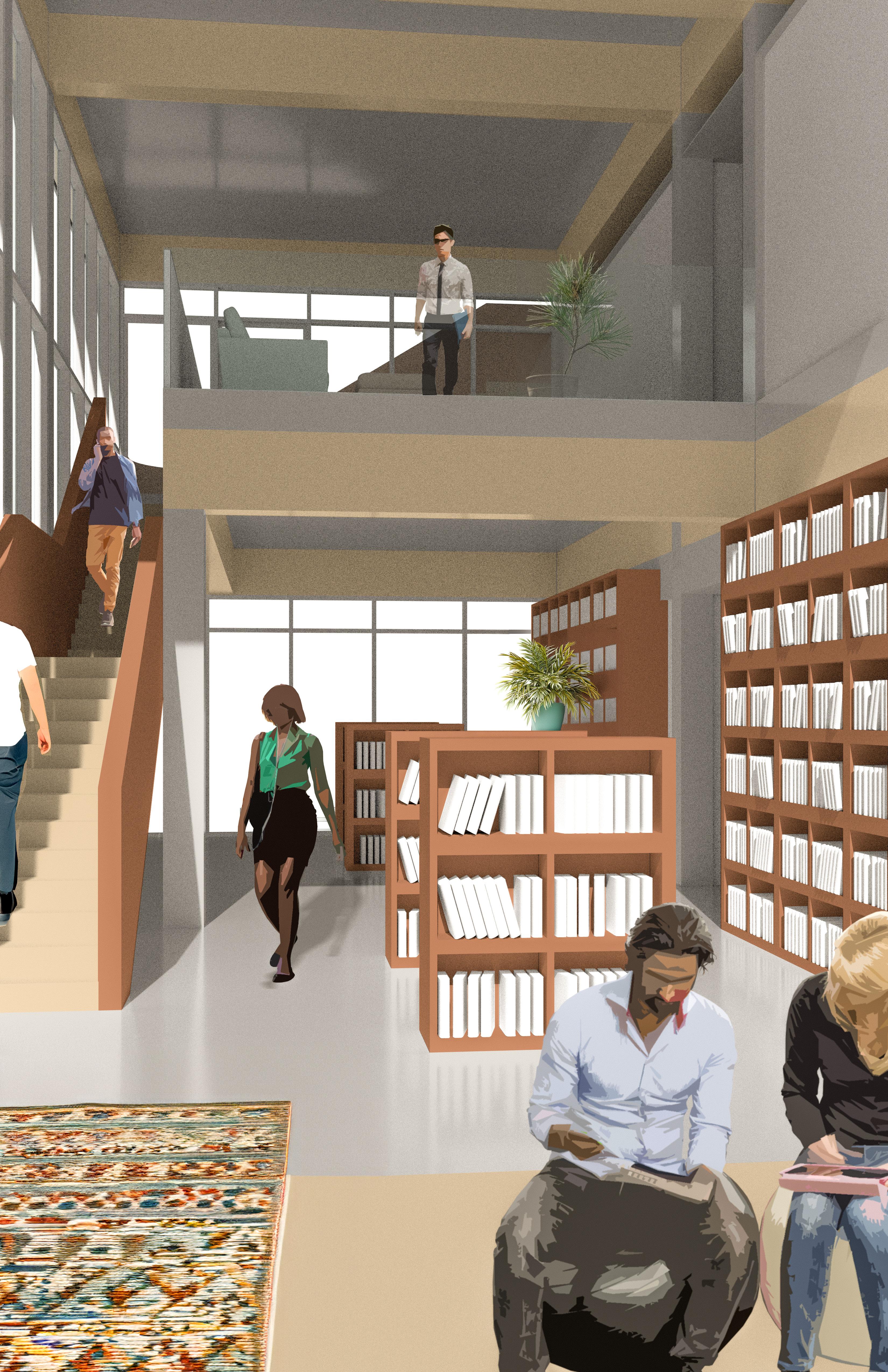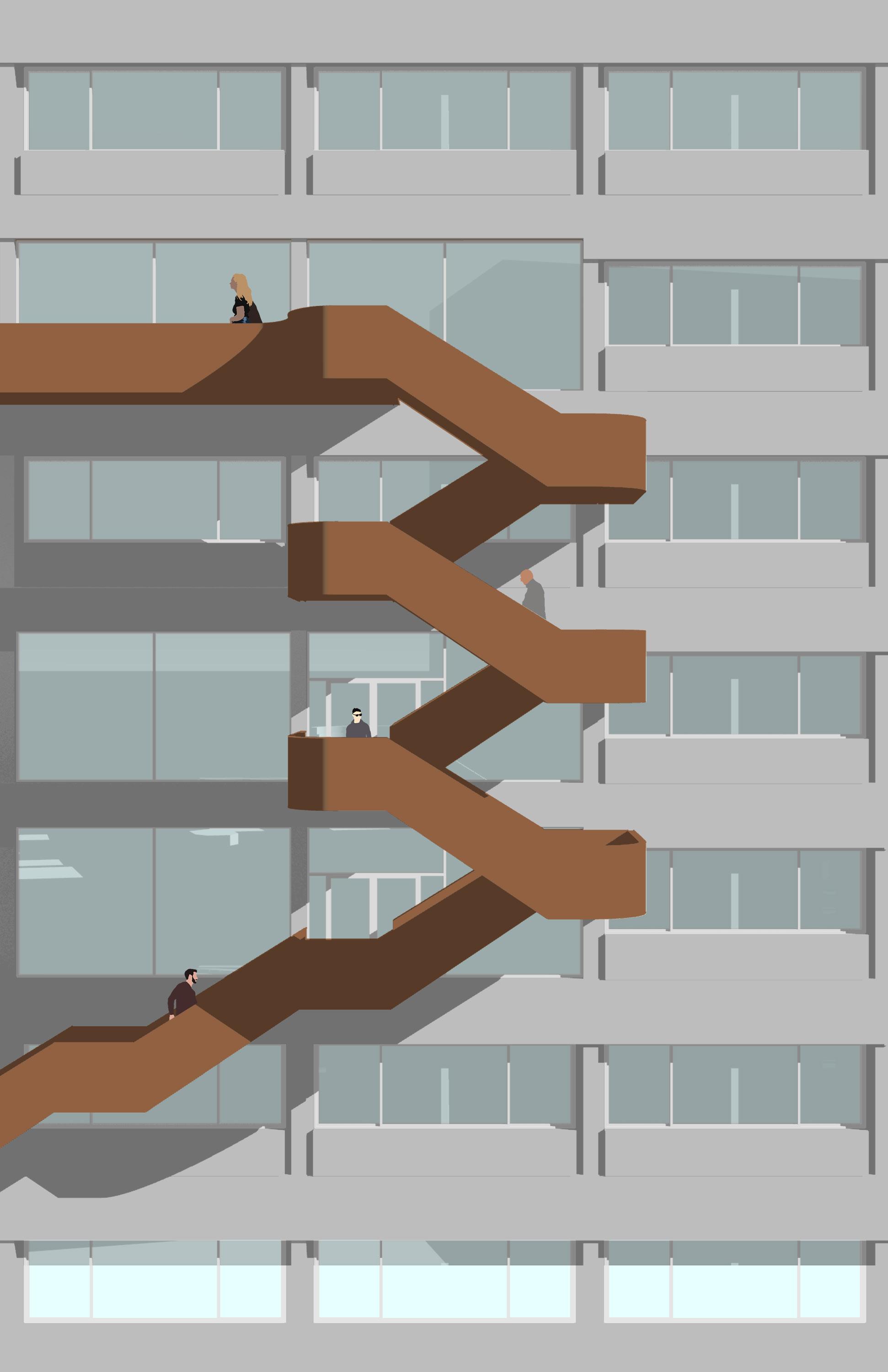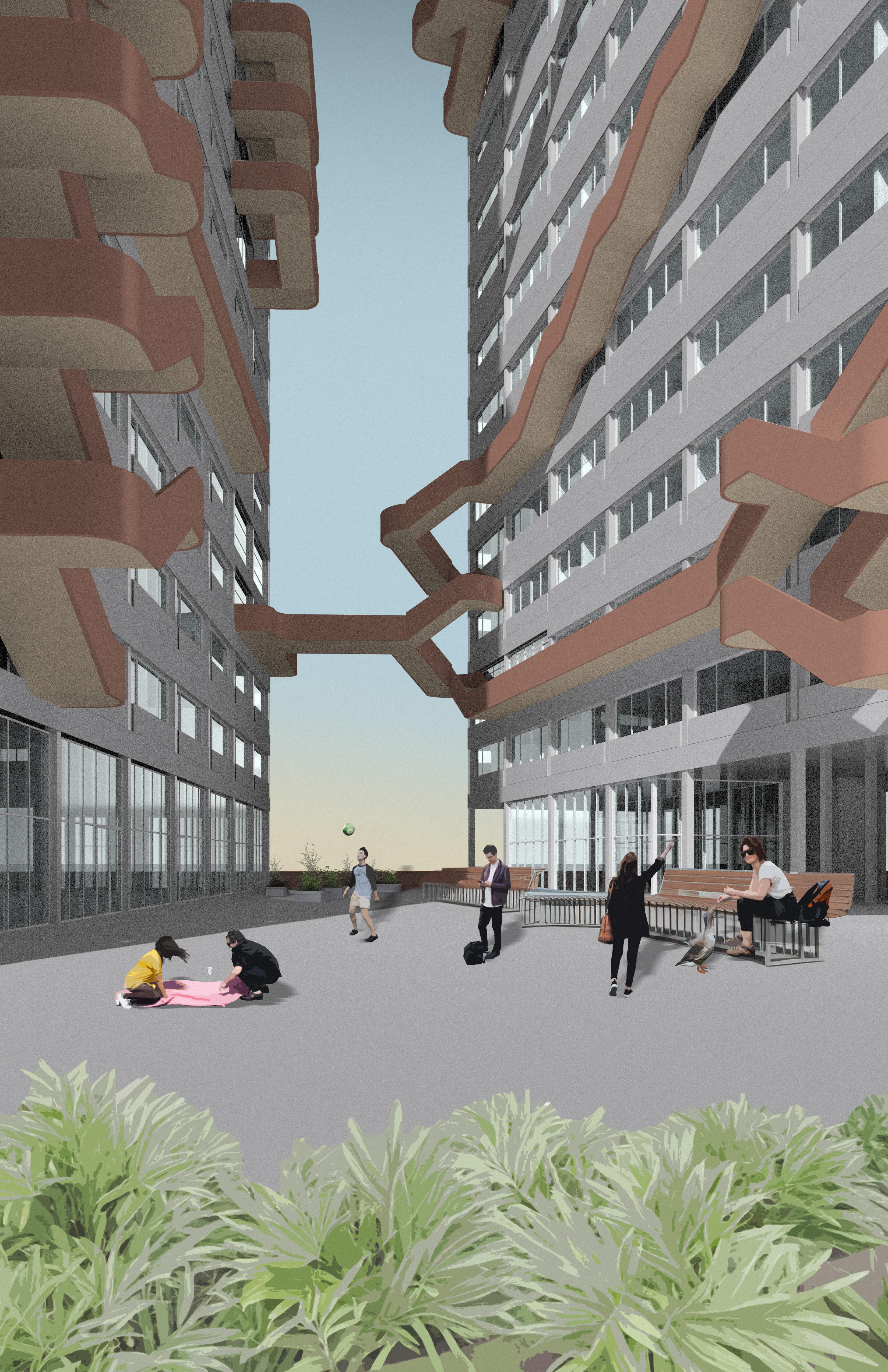 Our high-rise housing project reimagines vertical living by creating a “city within a tower”—a self-sustaining, interconnected environment that fosters community, accessibility, and natural integration. Designed as two interrelated towers, one is rotated strategically to optimize natural wind flow, enhancing passive cooling and ventilation while creating dynamic spatial relationships. The towers are connected through a network of exterior stair pathways, wrapping around the façade and linking various amenities scattered throughout the structure, encouraging outdoor movement and social interaction. Programmatically, the towers are divided based on unit types—one housing studio and one-bedroom units, the other containing two-bedroom units, with amenities tailored to each demographic. This approach ensures that shared spaces cater to the specific needs of the residents, creating a more engaging and functional living environment. By embedding a diverse range of amenities throughout the towers, rather than confining them to a single podium or top floor, the project promotes continuous activation of communal spaces across all levels. The design challenges the conventional high-rise typology by prioritizing openness, connectivity, and user experience, creating a vertical urban ecosystem that fosters a sense of belonging. This “city within a tower” offers a layered, multidimensional living experience, redefining the relationship between high-density housing and urban life.