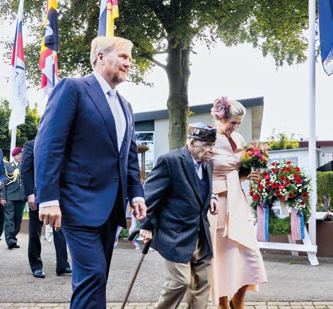 De koning en koningin zijn samen met een veteraan in Mesch. Dit dorpje werd in 1944 als eerste plaats in Nederland bevrijd.