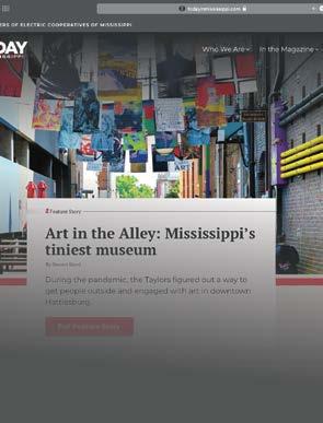 Today in Mississippi (ISSN 1052-2433) is published 12 times a year by Electric Cooperatives of Mississippi Inc., P.O. Box 3300, Ridgeland, MS 39158-3300, or 665 Highland Colony Parkway, Ridgeland, MS 39157. Phone 601-605-8600. Periodical postage paid at Ridgeland, MS, and additional o ce. The publisher (and/or its agent) reserves the right to refuse or edit all advertising. The magazine is published for members of subscribing co-ops. The magazine is a bene t of membership.