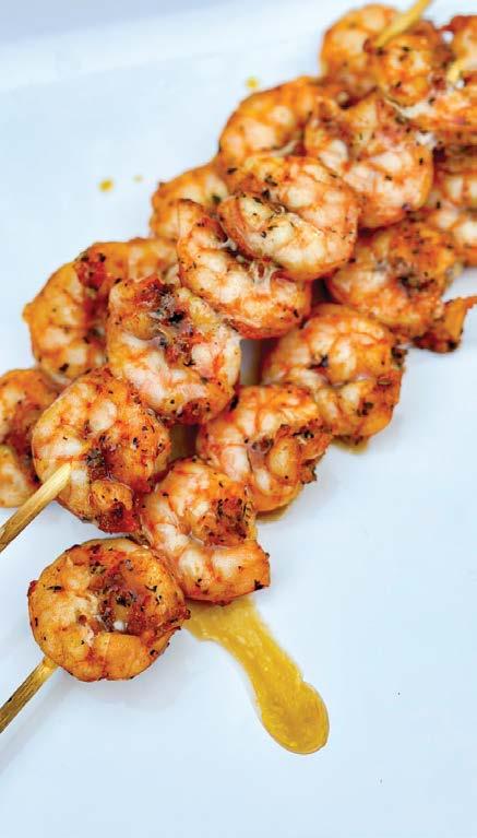Grilled shrimp is the easiest and quickest seafood to cook. To avoid having dry, overcooked shrimp, look for larger varieties, often labeled 16/20. Shell-on shrimp protects the meat and retains more moisture. Rinse shrimp in cold water and pat dry. Place 4 to 6 shrimp per stick, brush with olive oil, and season with salt and pepper. Place the skewers on the hot side of the grill and allow the shrimp to cook for 2 to 3 minutes per side until they are slightly pink with opaque flesh. Drizzle them with olive oil and fresh lemon juice or melted butter. Note: Serve immediately.