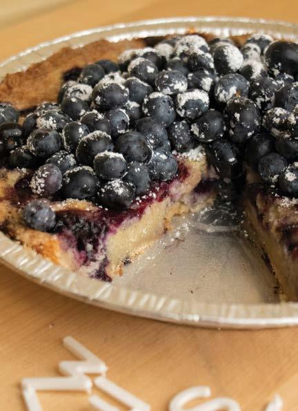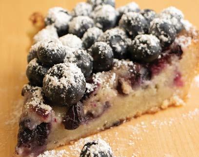 In a smaller bowl whisk together the melted butter, eggs, and extracts. Pour the butter mixture into the dry ingredients and stir to combine. Add the blueberries and stir to incorporate. The batter will be very thick. Spoon batter into prepared pan and spread evenly. Top with a few berries to give a nice polka dot pattern of fruit across the surface of the pie. Sprinkle the top with a little sugar. Bake for 30 to 35 minutes. Place pie in pan on a wire rack to cool. Top with additional fresh fruit and a dusting of powdered sugar. Serve with lemon curd and whipped cream, if desired.