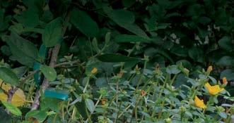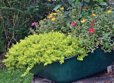 Creeping Jenny’s foliage ranges from lime green in part- to full-sun to soft chartreuse in shade. As it continues to grow, it will cascade over the sides of the wheelbarrow and flow down the tree stump.