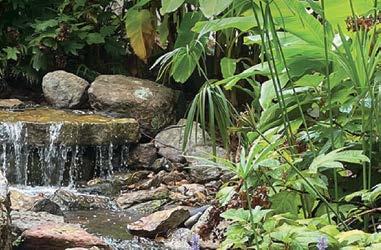 By blending evergreens, perennials, tropicals, and pollinator-friendly bloomers around the steady music of falling water, he has created a shady retreat that delights the senses and offers peace at every turn.