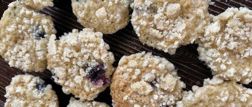 Divide the batter evenly into 12 muffins and top with the crumble topping gently pressing the crumble.