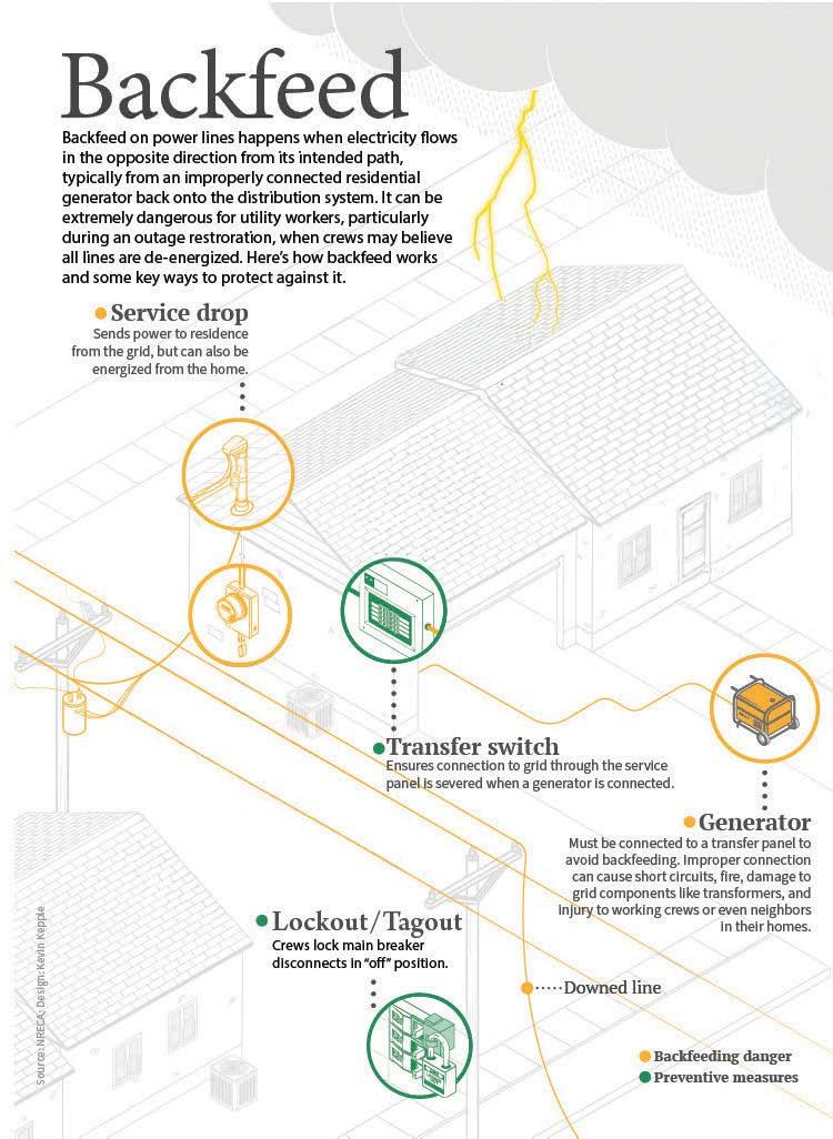 When generators backfeed, crews working to restore outages could come in contact with energized lines. The ground near a downed line could become energized near people working or children playing.