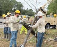 They climb the poles at any hour to fix the wires that give us power. In emergencies, when we have no electricity the linemen climb way up high and fix the problems in the blink of an eye. They never let the weather get them down, And you can see their trucks all over town. After storms in other towns, our men get their trucks And go right on down.