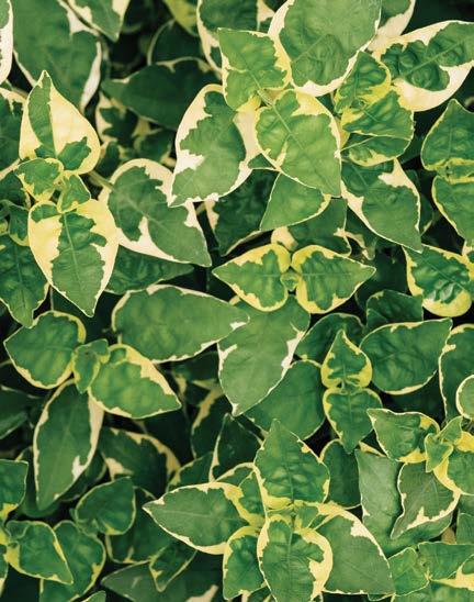 Miss Lemon Abelia is another exceptional evergreen shrub that adds color and texture to the landscape. Its standout feature is variegated foliage, with bright yellow margins surrounding rich green centers to create a luminous e ect year-round. During summer and fall, its delicate clusters of fragrant, pale pink or white trumpet-shaped flowers attract pollinators.
