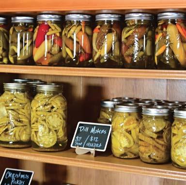 all made with care. The Grays are known for their homemade canned creations, from crisp, tangy pickles to jars of pickled vegetables and seasonal spreads. Much of that bounty comes straight from their own full vegetable garden, where they grow fruits and vegetables to include in the shop’s o erings. Each season brings something new to the shelves, connecting visitors to the rhythm of farm life.