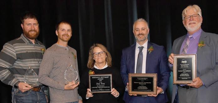 At the awards ceremony held in conjunction with the Wisconsin Electric Cooperative Association (WECA) Annual Meeting, recipients of the inaugural Cooperative Hero Award, Herman C. Potthast Award, N.F. Leifer Memorial Journalism Award, and Ally of Cooperative Electri cation Award (ACE) were o cially honored. Pictured (left to right) are Aaron Holten, Tyler Romsos, Dee Fox, Trevor Clark, and Lynn Thompson.
