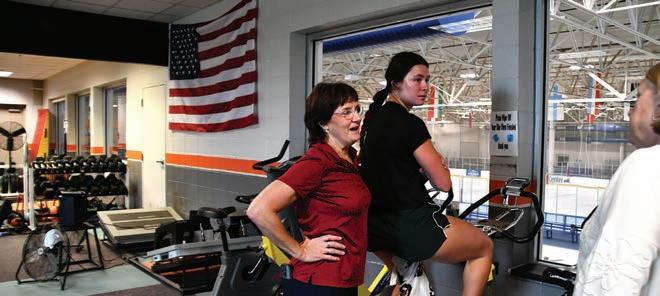 Bonnie Blair cheers on her daughter, Blair Cruikshank, as she rounds a turn. Bonnie chats with Blair on an exercise bike in the training room. Bonnie discusses her passion project, DASH, which stands for Developing Athletes for Speedskating High-Performance.