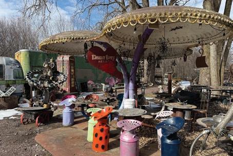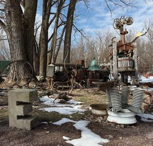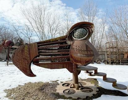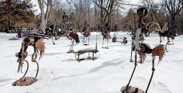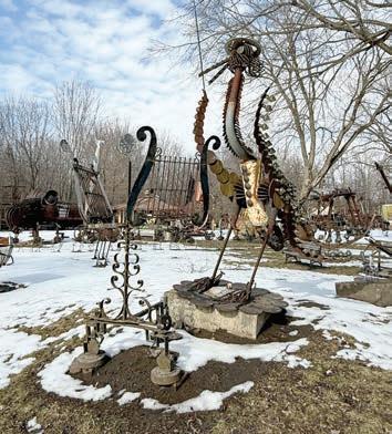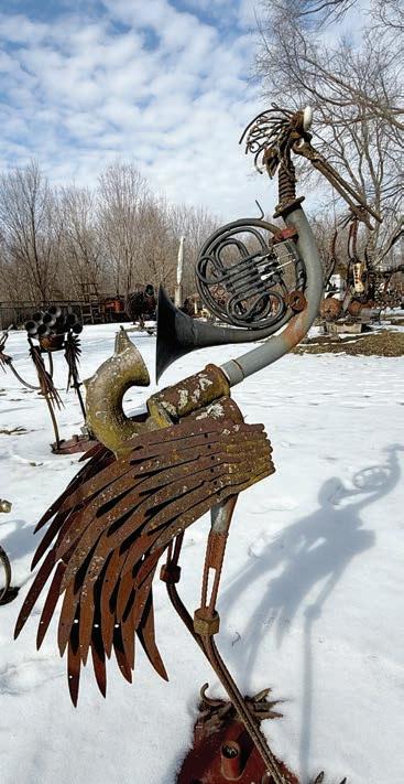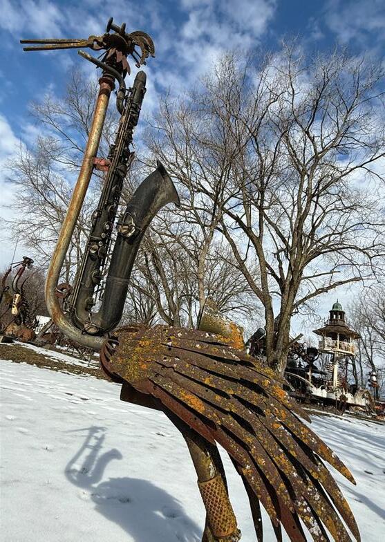 “The Bird Band started when my mom found brass instruments at St. Vinny’s,” Kottler said. “My dad got big eyes and went back to buy the rest.” Additional horns came as factory rejects from a maker near Delavan. The birds’ “feathers” are Fiskars blades— garden shears once produced in Sauk City. Evermor bought them by the pallet.