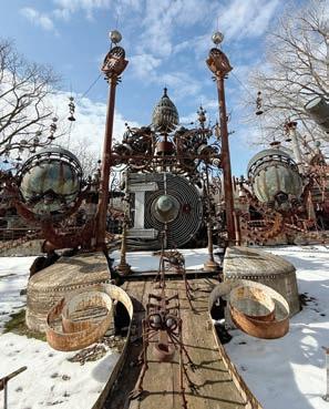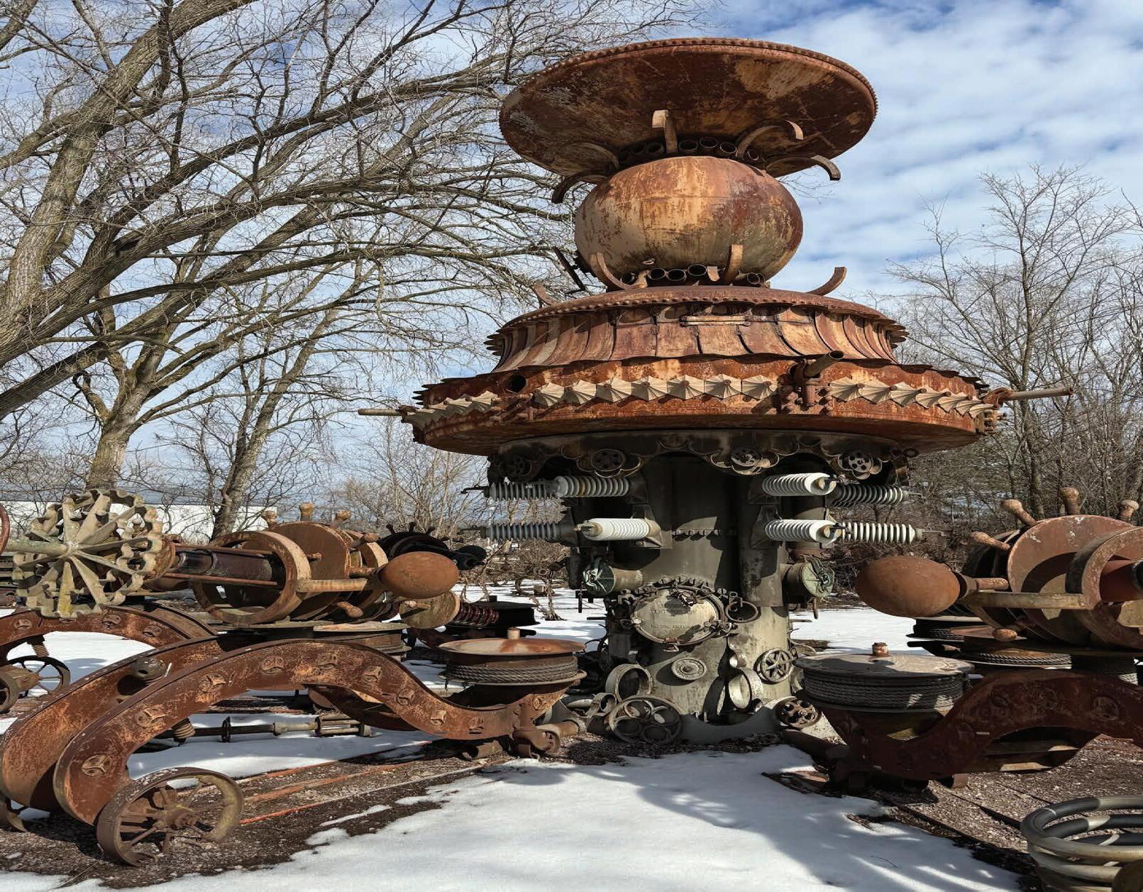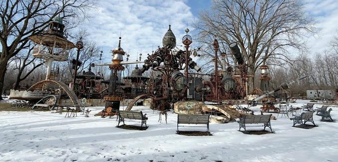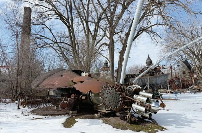 Just off Highway 12 south of Baraboo, visitors enter a land of absolute fantasy—coils, domes, and a gleaming cylinder, surrounded by a forest of spindly legs and beaks. At the center is the Forevertron, an enormous whimsical masterpiece made of rivets: a 500,000-pound intergalactic and interdimensional time travel machine that, according to its maker, runs on “level 7 love energy.”