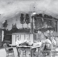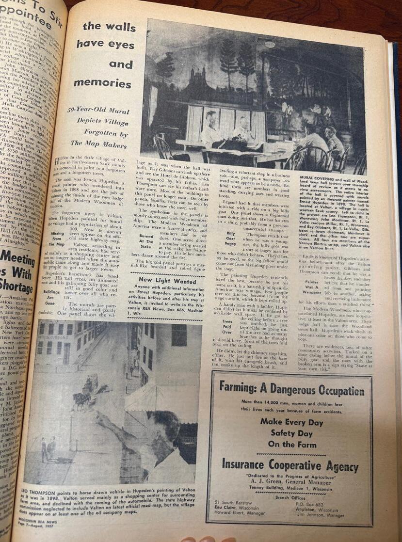 We rst covered Ernest Hüpden’s Painted Forest 68 years ago in the Wisconsin REA News. Above center: Leo Thompson was identi ed as pointing to one of the murals. Above right (as it read in 1957): Mural covering end wall of Woodland town hall towers over township board of review as it meets to review assessments. The entire interior of the hall is covered with murals painted by an itinerant painter named Ernest Hüpeden in 1898. The hall is located in Valton, a village in northwestern Sauk County. Left to right in the picture are Leo Thompson, Rt. 1, Wonewoc; John Mortimer, Rt 1., La Valle; Isadore Miller, Rt. 1, Wonewoc; and Ray Gibbons, Rt. 1, La Valle. Gibbons is town chairman, Mortimer is clerk, and the other two are supervisors. All four are members of the Vernon Electric Co-op, and Valton also is on Vernon lines.