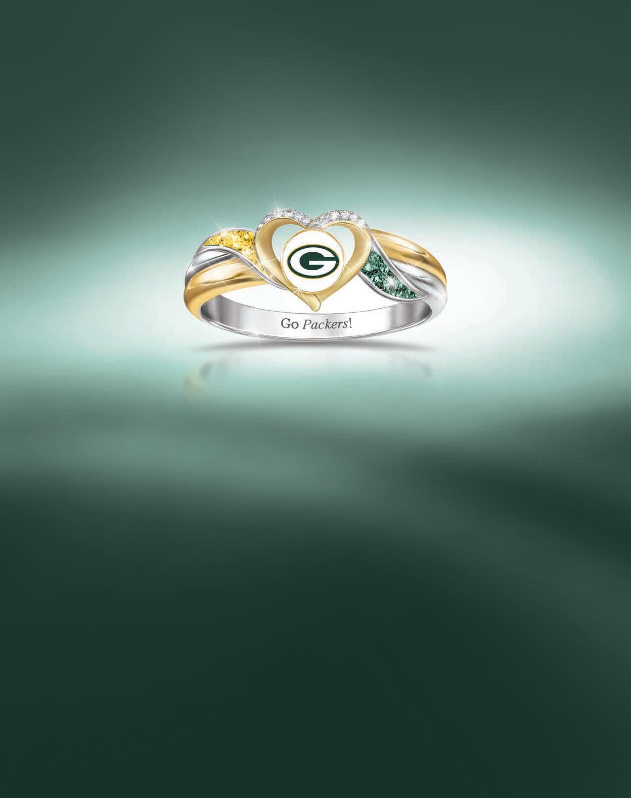 Hand-crafted in an Exquisite Design Crafted in solid sterling silver, our custom-designed ring features twin bands—one shimmering in silver and one plated in gleaming 18K gold. At the center of the design is the Green Bay Packers logo in teamcolor enameling, surrounded by a gold-plated heart and two glittering pav é ribbons of team-color crystals that wrap around the band. And adding to