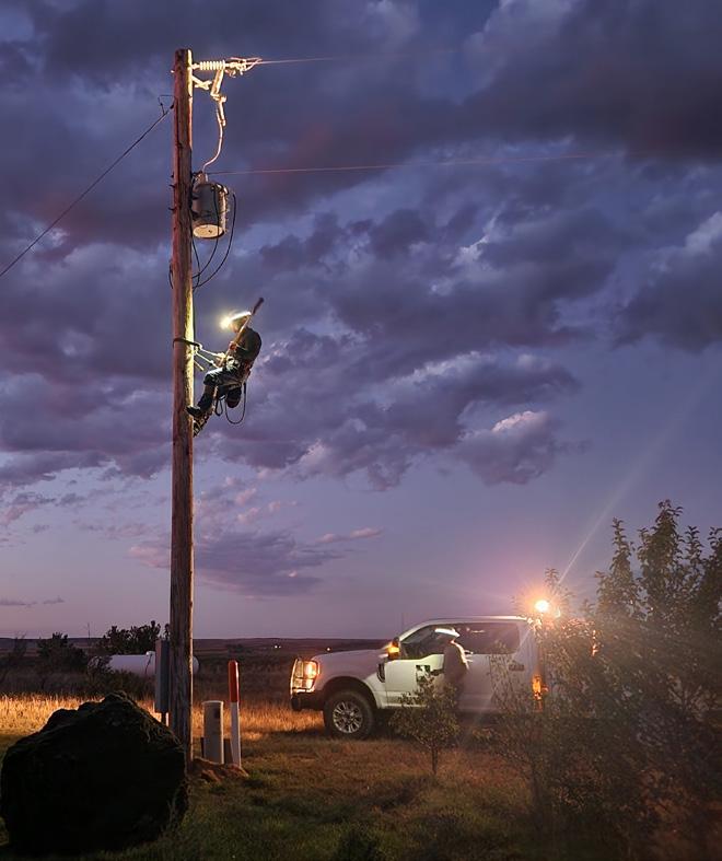 While the storm didn’t cause a large outage - just a handful like Terri’s house - it’s a great example of what our cooperative linemen do on a normal evening when they are part of an on-call crew. Wyrulec crew members still climb poles in order to repair or replace equipment, which can save a lot of time compared to bringing a bucket truck on site. On this particular night, the linemen were also sporting some new gearthe lamps on their hard hats are a newer style called halos, as opposed to the previous style, which were spot-light type lamps.