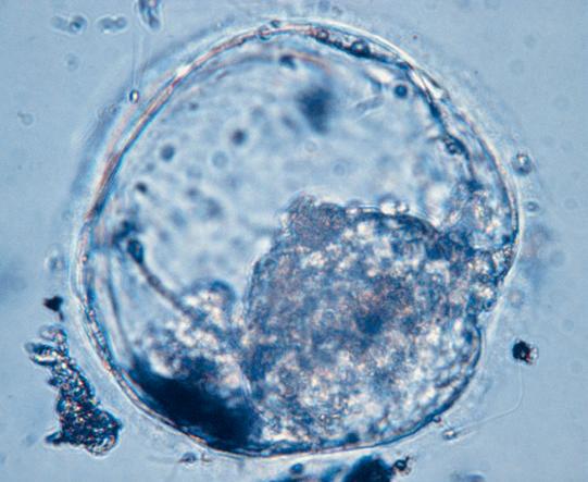 En blastocyst. Den inre cellmassan (mörkare grå) innehåller de celler som kommer att ge upphov till själva embryot. Bilden är tagen med ljusmikroskop.