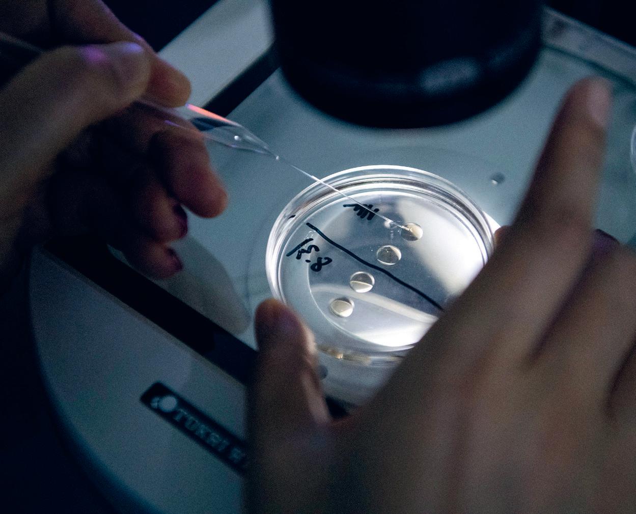 En forskare använder en tunn glaspipett för att hålla en obefruktad äggcell under mikroskopet. Med hjälp av en annan pipett (från höger) kommer forskaren sedan att injicera en cellkärna. Proceduren är svår och misslyckas ofta.