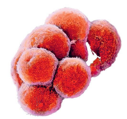 Cellerna i morulan fortsätter dela sig, och cellklumpen utvecklas till en ihålig blåsa, en så kallad blastula . Hos däggdjur kallas blastulan för blastocyst . Cellerna i blastocystens vägg kommer att ge upphov till fosterhinnorna och moderkakan. Inne i blåsan finns den inre cellmassan, som kommer att utvecklas till själva embryot. I den inre cellmassan är alla celler fortfarande lika varandra. Dessa celler kan odlas i laboratorium som så kallade embryonala stamceller (ES-celler, se fördjupning om stamceller på sidan 17).