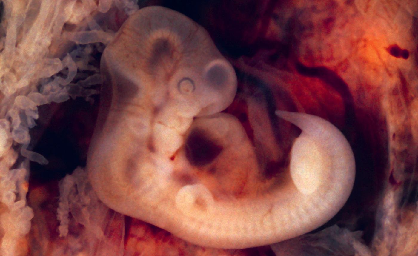 Ett människofoster fem veckor efter befruktning är cirka 2 millimeter långt (ungefär lika stort som ett sesamfrö). Främre delen av nervröret har börjat utvecklas till hjärnan (blåsorna överst på bilden).