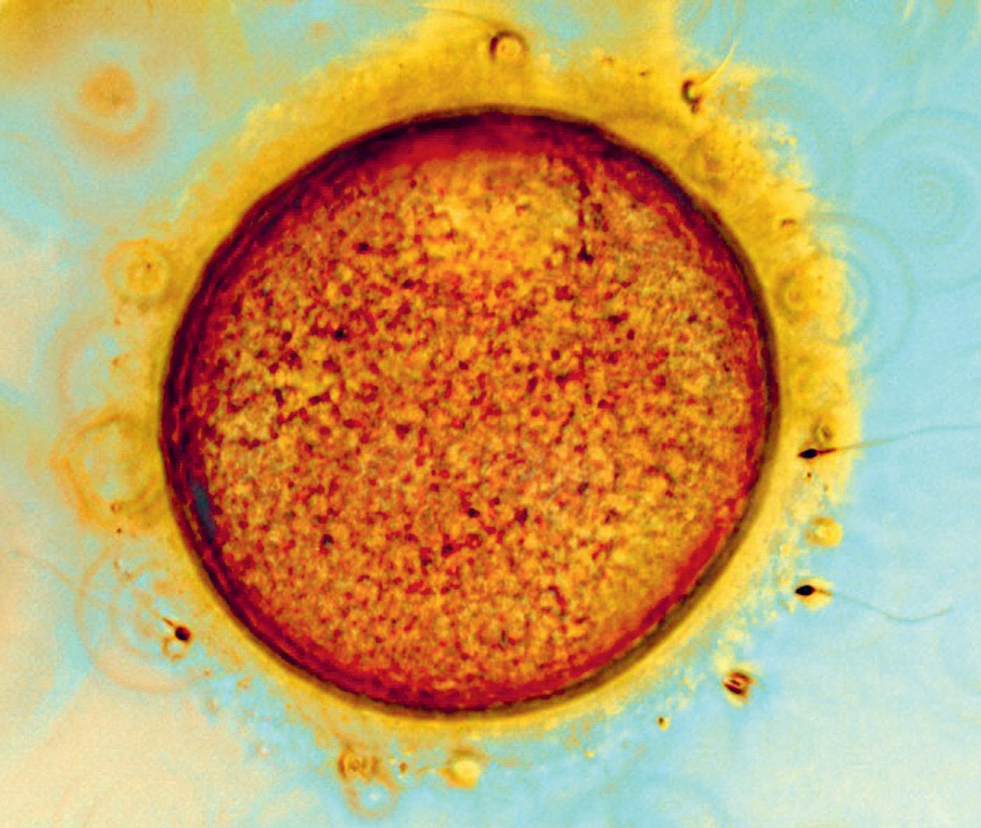 Äggcell och spermier vid provrörsbefruktning (in vitro-fertilisering). Bilden är tagen med ljusmikroskop.