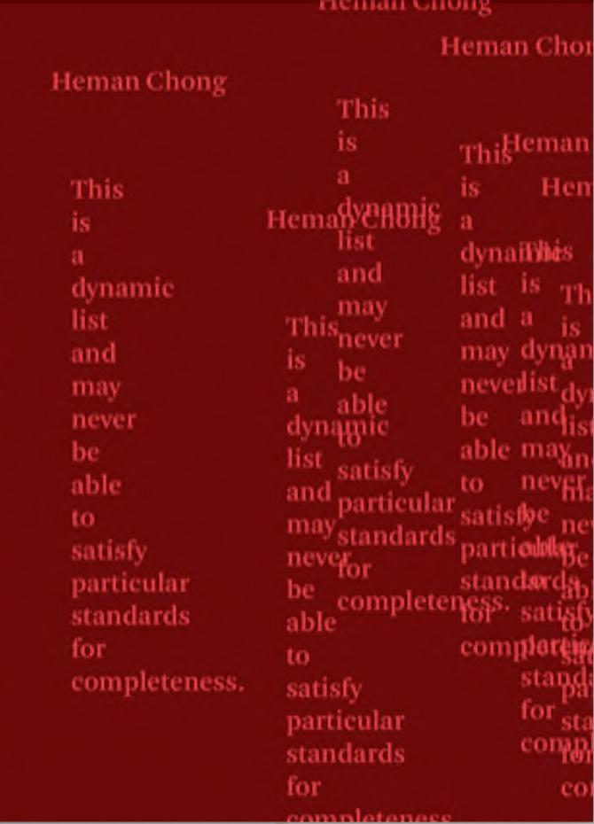 A key artist in Singapore’s art history, Heman Chong’s multi-faceted practice dates back to the early 2000s. This publication accompanies a survey exhibition of the same name, which presents recent artworks including new commissions that reconsider canonical pieces from his oeuvre. Known for his acerbic wit, Chong’s art addresses contemporary geopolitics and the infrastructural ironies of our data-driven and networked society. Heman Chong: This is a dynamic list and may never be able to satisfy particular standards for completeness surveys the artist’s practice, with essays by international curators who have collaborated with him throughout his career.
